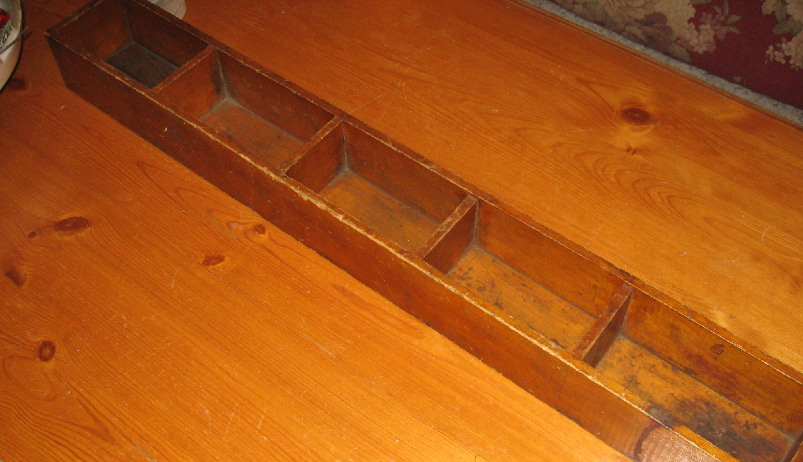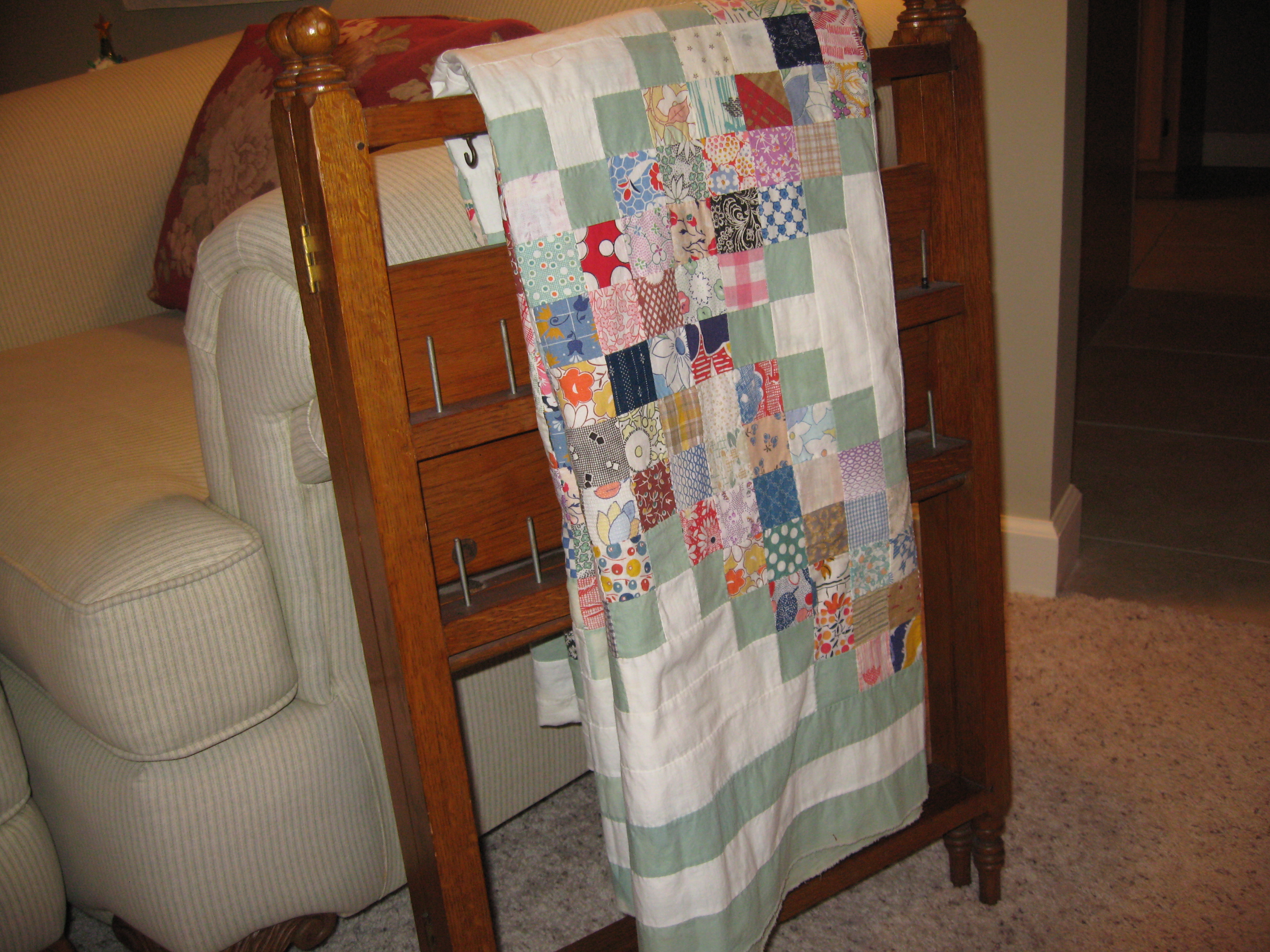 I could just see her………after taking care of her family all day, finding time in the evening to sew on her quilt. Sitting by the fire stitching. Maybe she had one of these sewing “caddies” beside her couch too? I just can’t bring myself to take it apart.