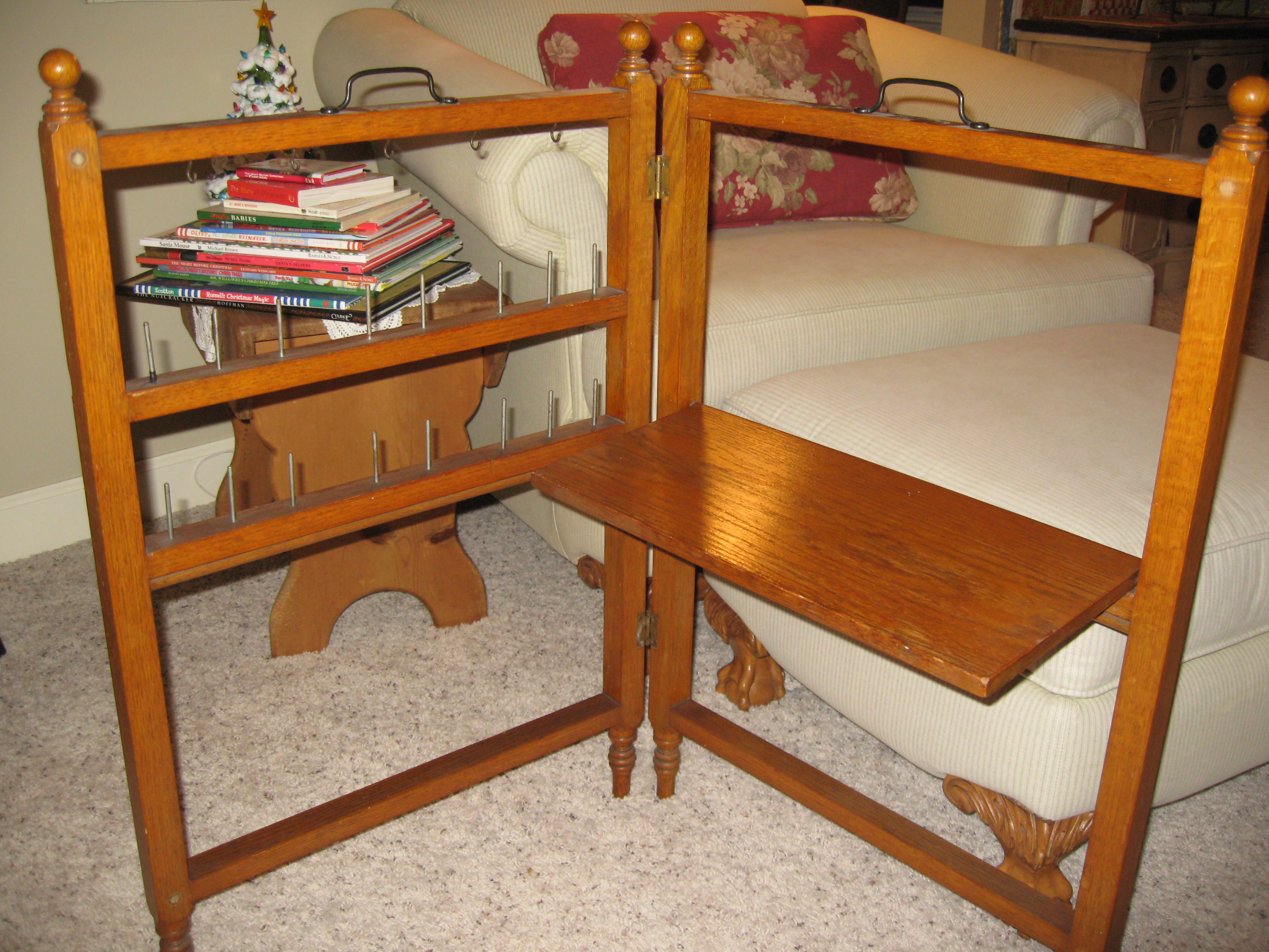 Isn’t this the coolest thing. I’ve never seen one of these. It sits beside the couch or bed and holds your work and threads. Then, when you’re finished, you just fold it back up! I wonder how old it is?