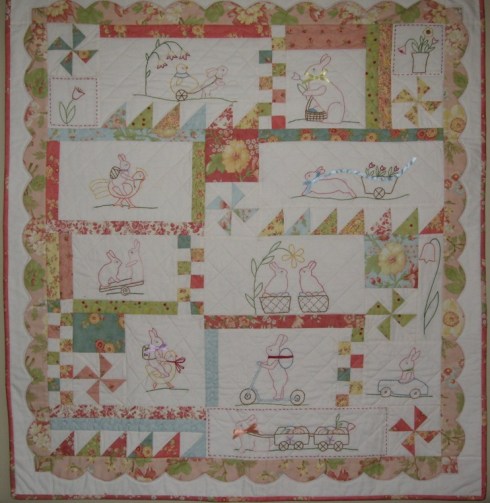 They are a resource for finding blogs in your state, or what’s going on in the blogging world. They offer quilting tips and tricks and tutorials. Every week they have a themed contest. This week is Easter quilts. I added my Rabbits Prefer Embroidery to it this time. It’s a Bunny Hill design that is redwork but I decided to use pastels for Easter. The prize is Christmas fabric! You know I couldn’t resist that:)