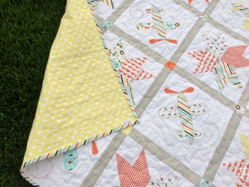 I used a Kona Ash to frame everything and before you knew it, I had a finished quilt. Paige quilted it for me in a loopy soar and I finished it off with the stripe binding and a polka dot backing…so sweet!