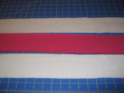 You will need 3 pieces of fleece cut 3″ x 22″ for a smaller dog or 3″ x 40″ for a bigger dog.