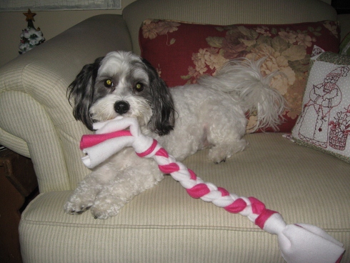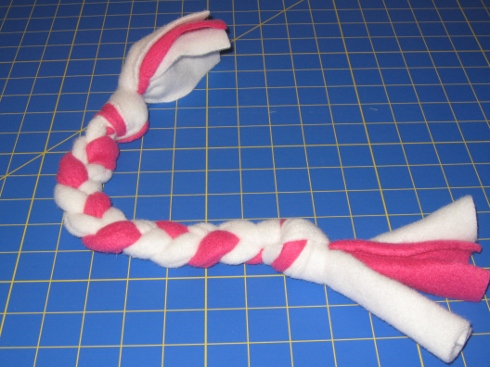 An easy gift that you can make with your leftover fleece scraps is a doggie rope.