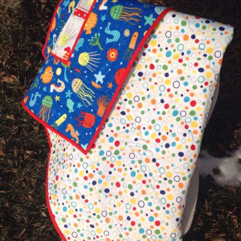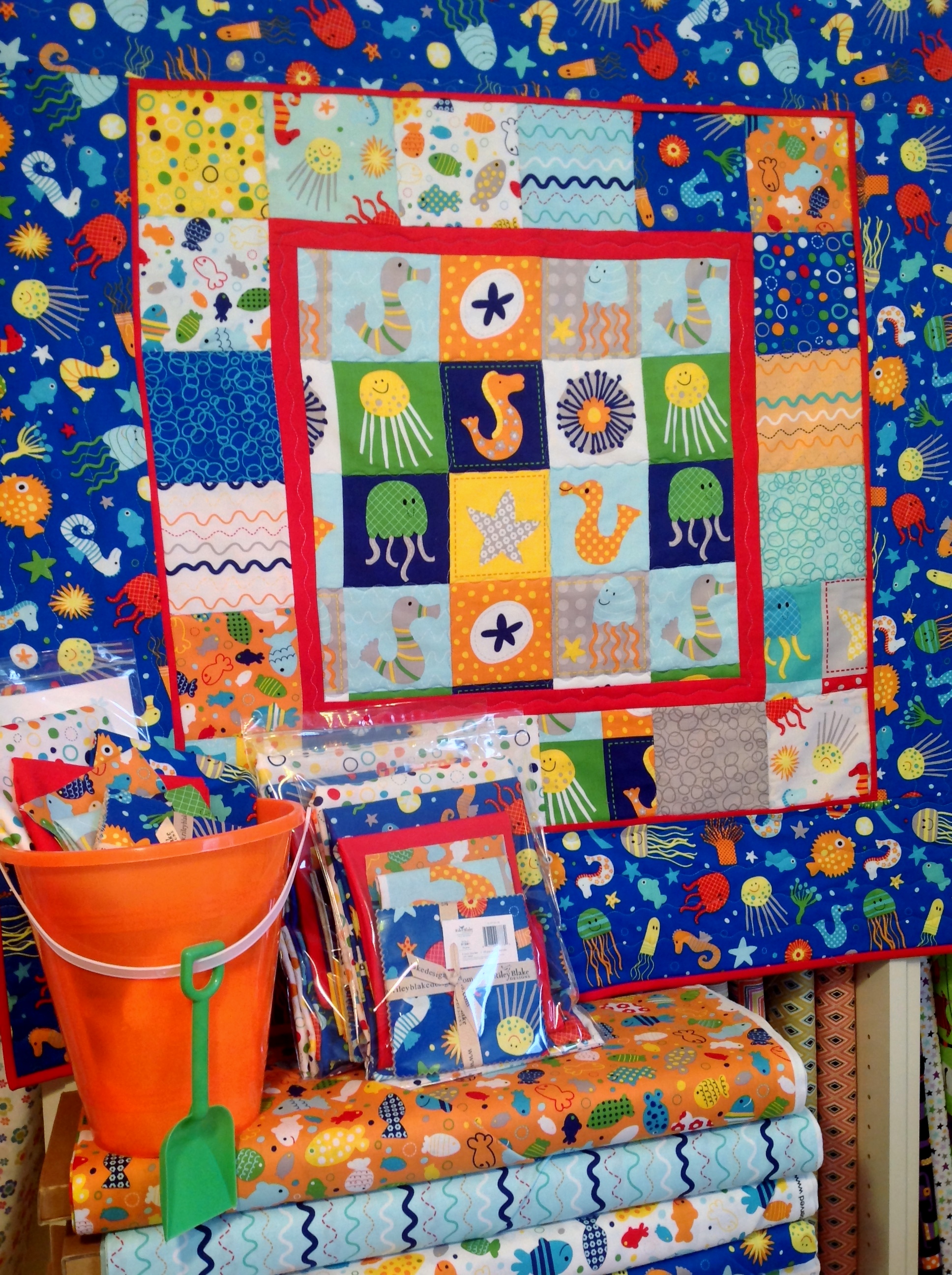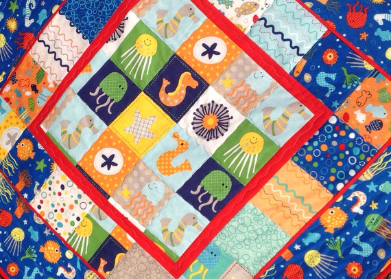 January’s hand made cuteness is a baby quilt made from the Riley Blake line called “In The Ocean“. Schools of fishes, seahorses , smiling jellyfish, and mulit-colored bubbles will make baby’s room bright and playful.