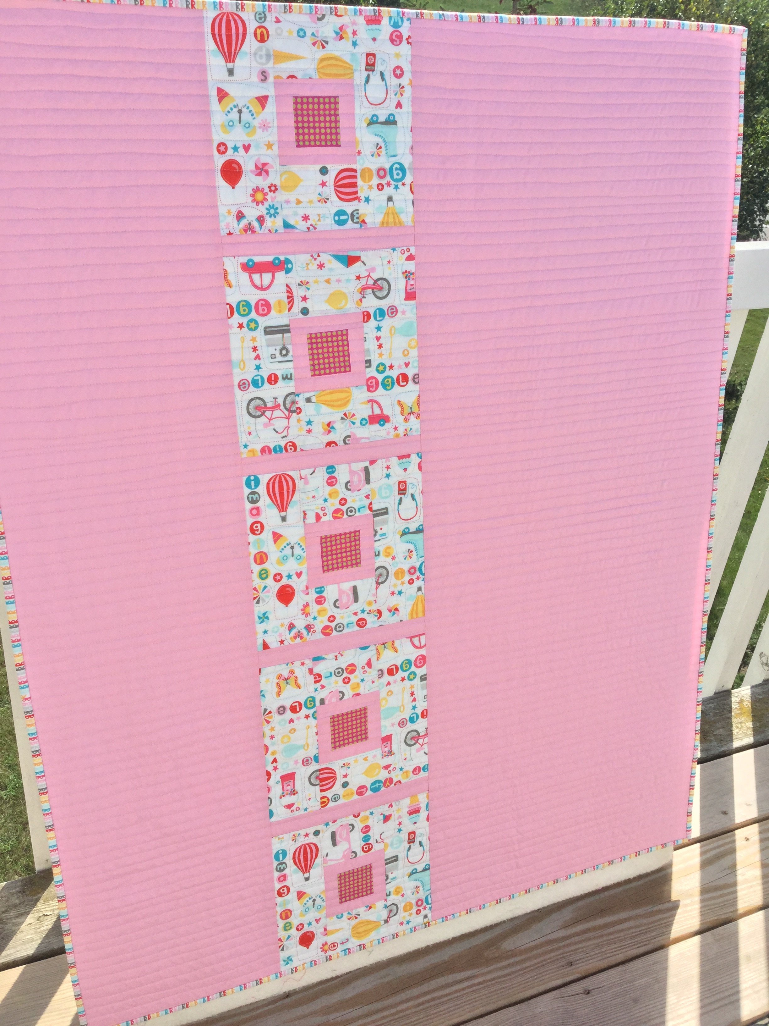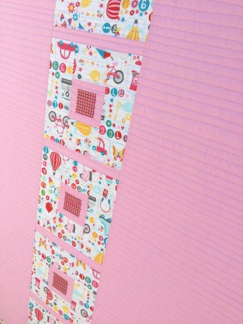 I used one of our easiest patterns, ‘Baby Me Blankie’, to make this baby girl quilt. Simple cutting and strip piecing help this baby assemble fast! Wanna know how long it takes me to make one of these? 40 minutes. Yep. You heard me right…40 minutes! So, if I factor in cut time, I’ve made this quilt top in less than an hour.