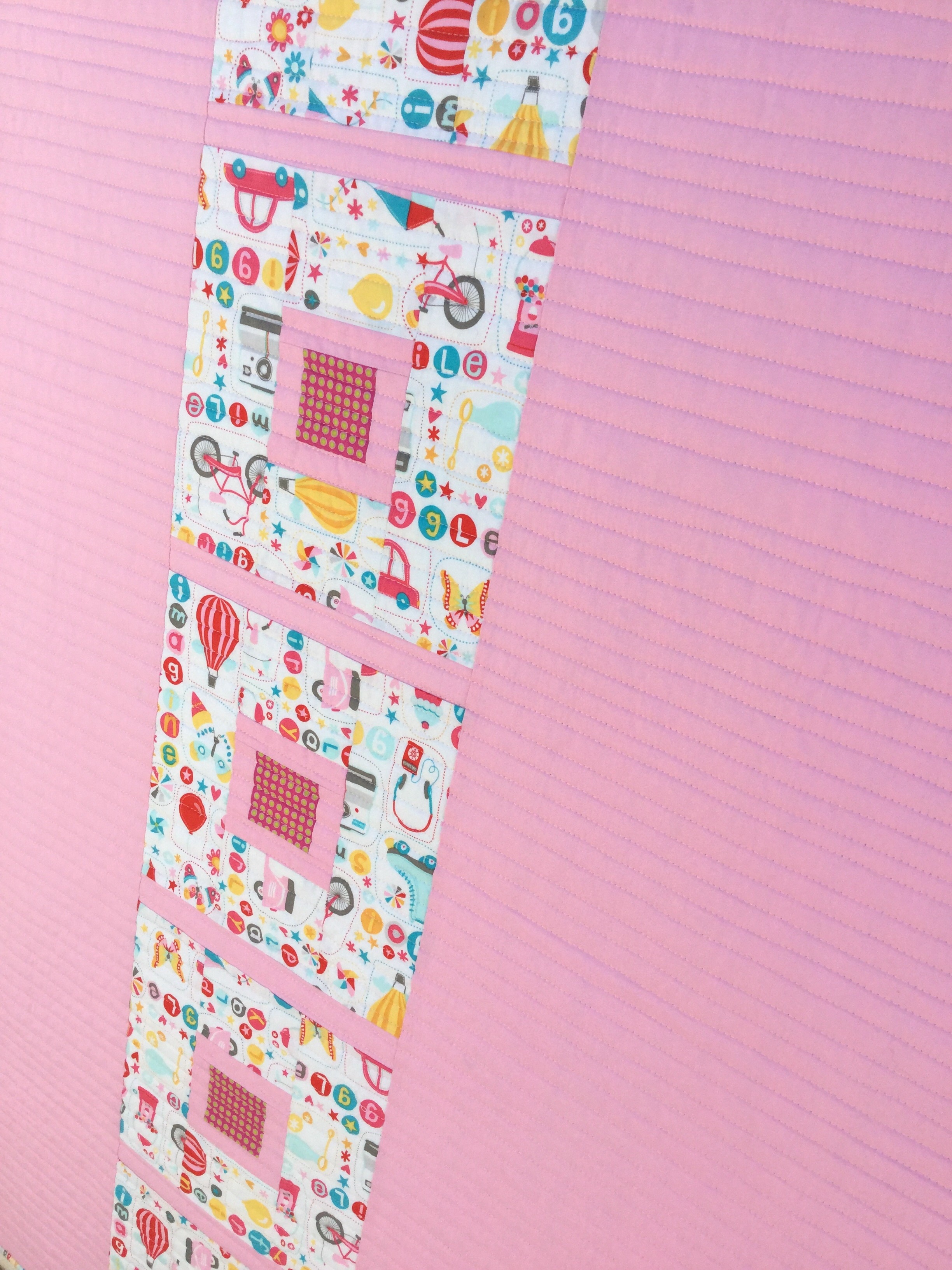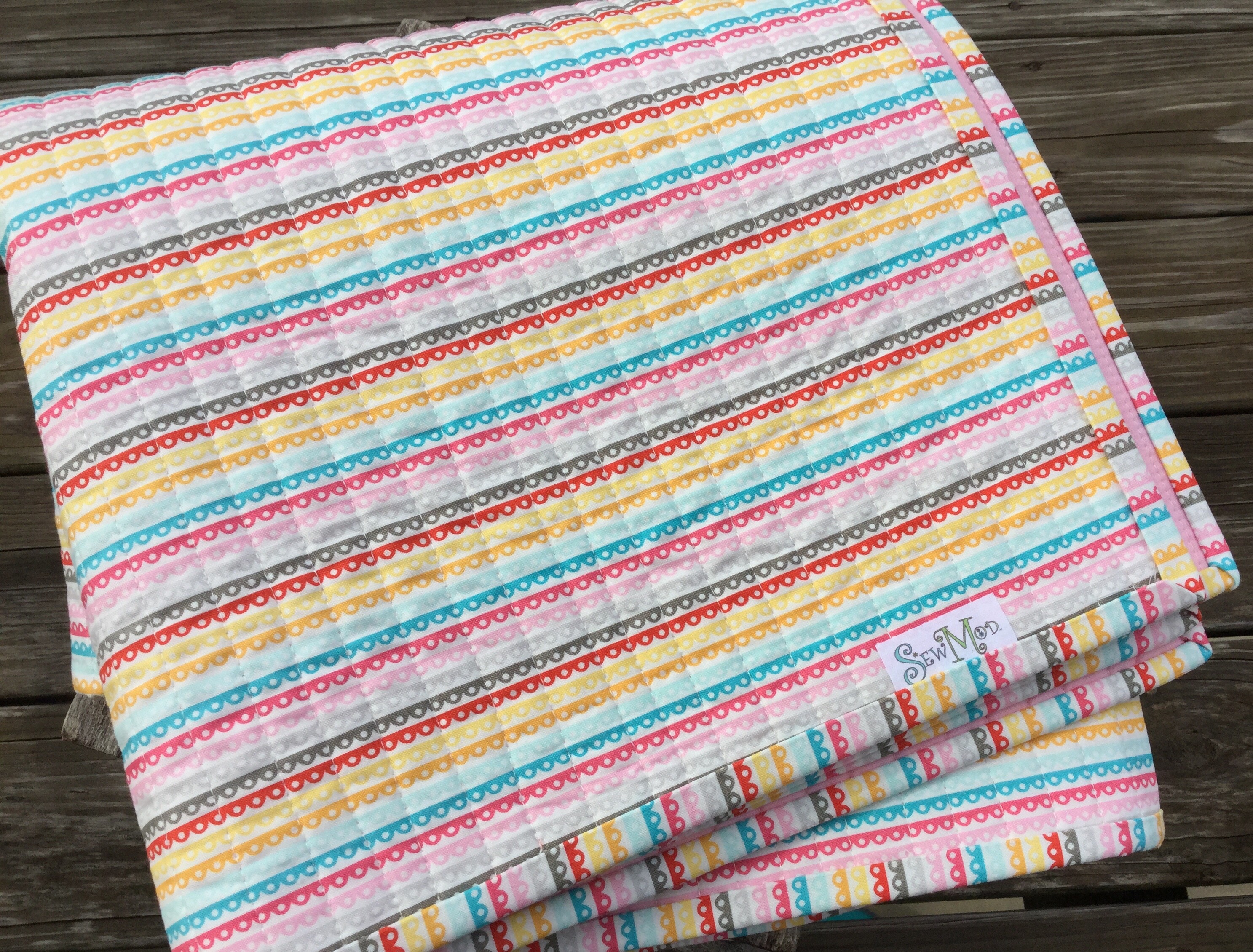 The quilting on ‘Baby Me Blankie’ is simple enough to do yourself. Heck, I even did it! All you need to do is properly pin the layers and stitch a 1/4″ along each side of the strips seam allowances. Wanna know how long it took me? About 45 minutes!