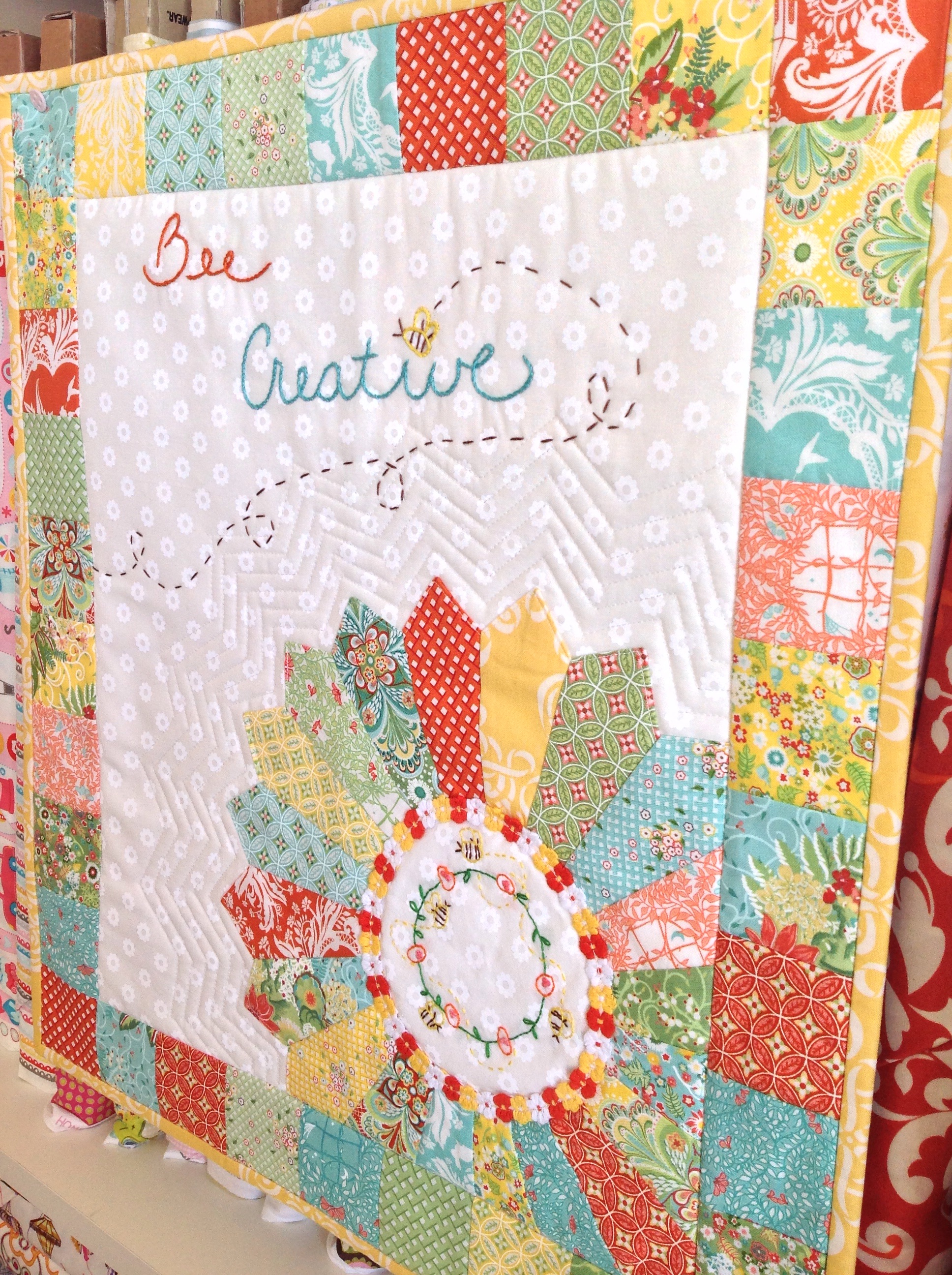 Most of my fabrics were Central Park & Fandango by Kate Spain. I made the tree leaves from just a charm pack. And trees can’t grow without sunshine, right?