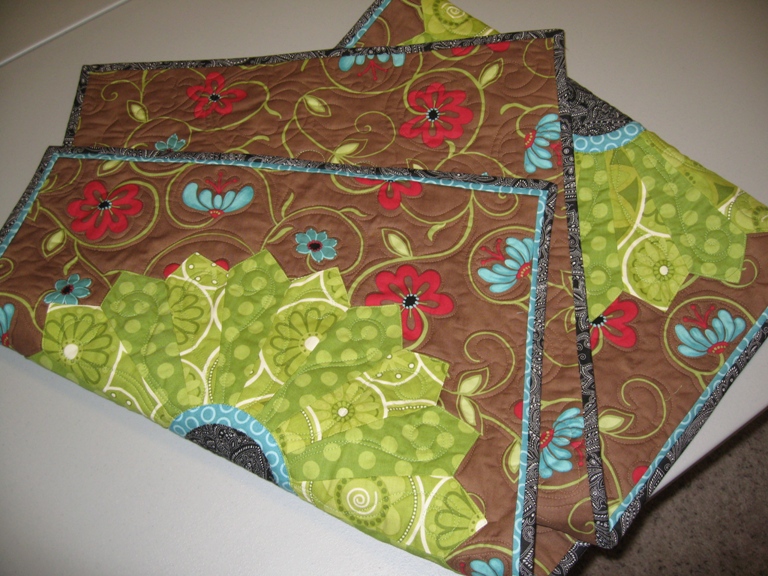 I also made a set of 6 matching napkins to go with it. Both the table runner and napkins have a little extra touch with the teal flange. I think it really sets it off. And Paige’s quilting is awesome as usual!