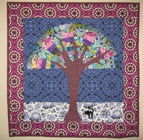 I wish the camera picked up all the beading she added to her quilt. It’s along the grass line, the kitty’s eyes, and in the leaves.