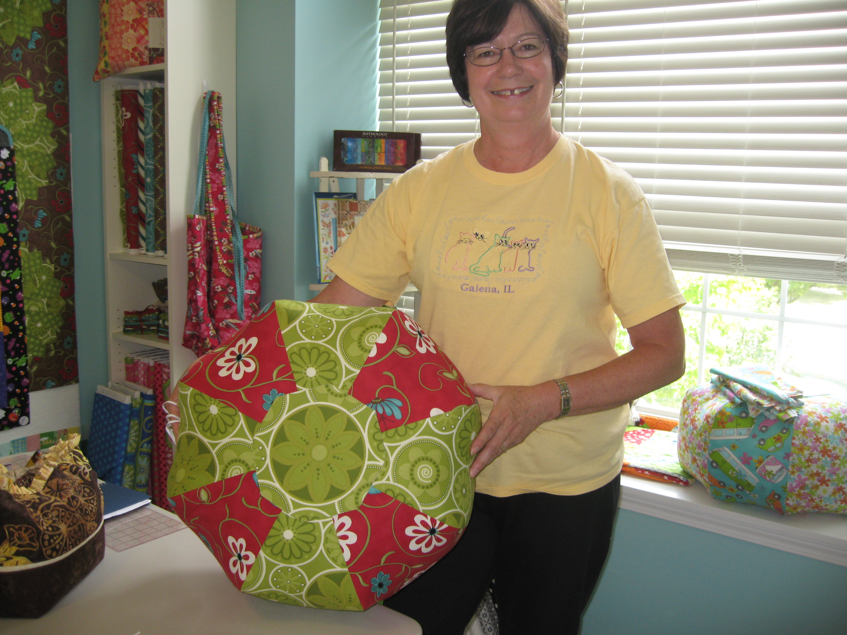 A couple of Gumdrops …A couple of friends joined in on the Gumdrop fun. Kathy made hers from the Artful Home fabrics. We love how she fussy cut the green daisy for the top.