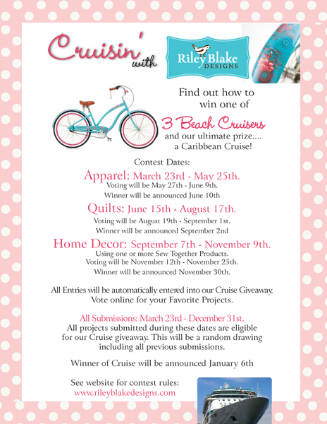 Or…I could try to win one & you could too! Riley Blake is having a quilt contest. Get a chance to win a Cruiser by making a quilt with Riley Blake fabrics and enter it in the contest. Details found here..Woo-Hoo!