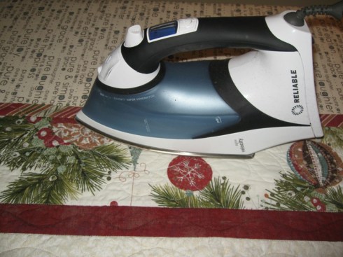 Attach your binding the way you normally do. **My bindings are cut at 2-1/8″ to 2-1/4″. This is an even distribution on binding on the front and back and allows you to just catch the back binding while using this machine binding technique.** After the binding is sewn down, iron your binding flat. This helps you pull it around to the other side. BTW, this is the best iron ever! I didn’t think anything could ever replace my Maytag cordless iron but this Reliable iron is sooo awesome!