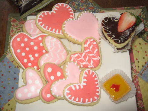 This Sunday was our SewMod Sew-In and I have to share with you the desserts we snacked on. Pattie is our talented cookie maker. Delish! Beautifully decorated and always tastes sooo yummy. Pattie, if you were missing a couple when you got home, Russell said he snagged 3 of them! I can’t really blame him though:) Vicki brought the cute little Lemon Tarts and the fabulous Valentine Cheesecakes.