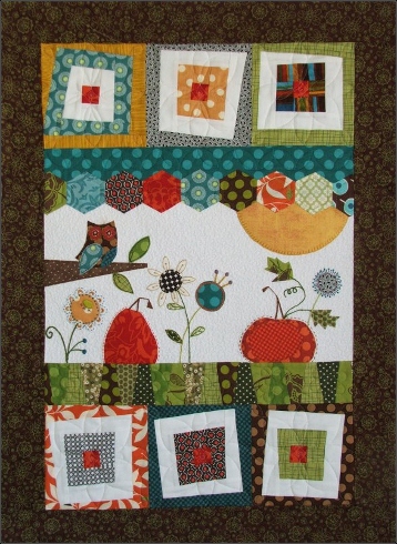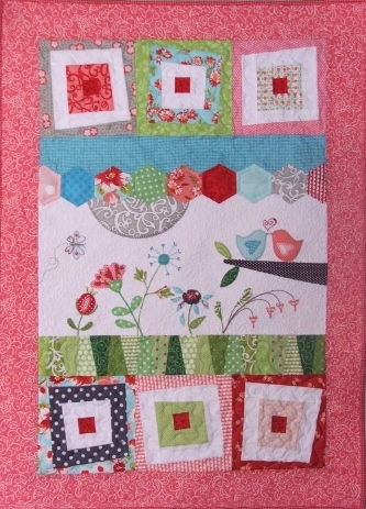 I really enjoyed doing this. This pattern has many techniques in it that kept me interested. Embroidery of course, applique, both hand and machine, making the hexagons, and using the easy dresden to make all the wedges for the grass and the sun. The one thing I had never done was make the wonky log cabins. I saved them for last and as you can tell by this middle blue and pink one, my first attempt was a little not so wonky.