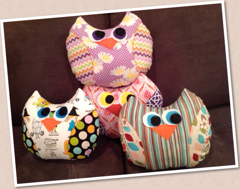 Make these softie owls up for someone special. Makes a great gift for the little ones, whether it’s a holiday gift featuring Christmas or Halloween fabrics or to hang out with them as a room decor or an owl friend!
