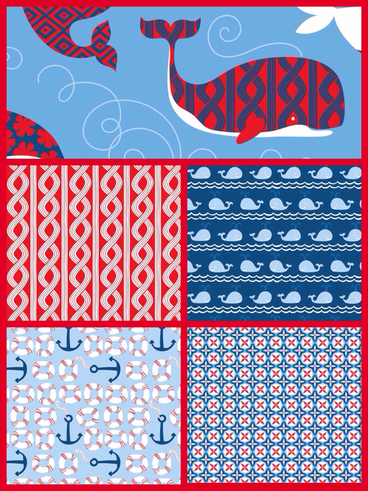 “Have a whale of a good time with the fun nautical prints in the True Blue Collection featuring whimsical whales, splashing waves and fun geometrics. Anchors away!”