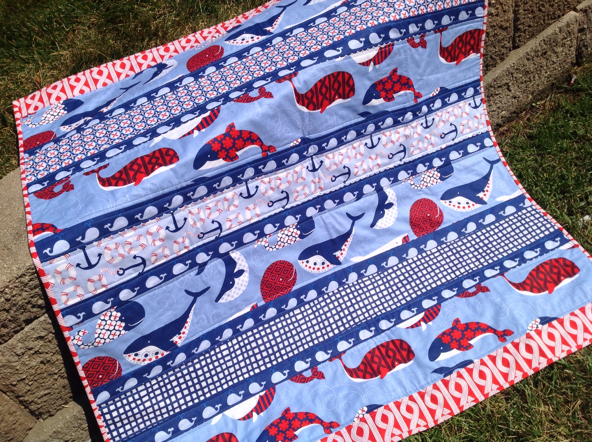 I knew I wanted to do a strip quilt with this line. It’s perfect with the big playful whales and the baby whales in a row!