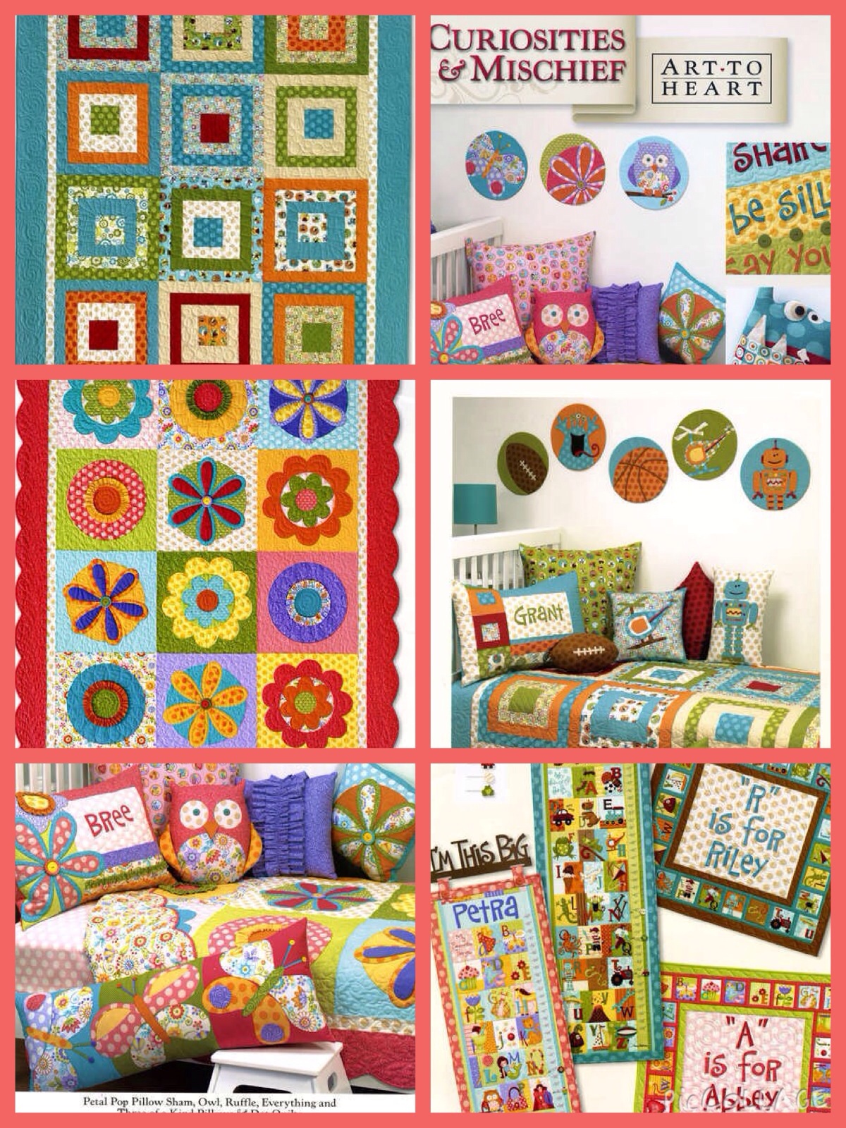 “Full of curiosity, mischief, wonder, energy and love. Kids are the best! These projects will make their lives more bright and fun. Children’s theme projects include: quilts (68″ x 68″), wall quilts, pillow shams, pillows, nap mats, tooth fairy pillows. Pull out section of patterns included. Uses Benartex fabric from the Mischief and Curiosities lines.”