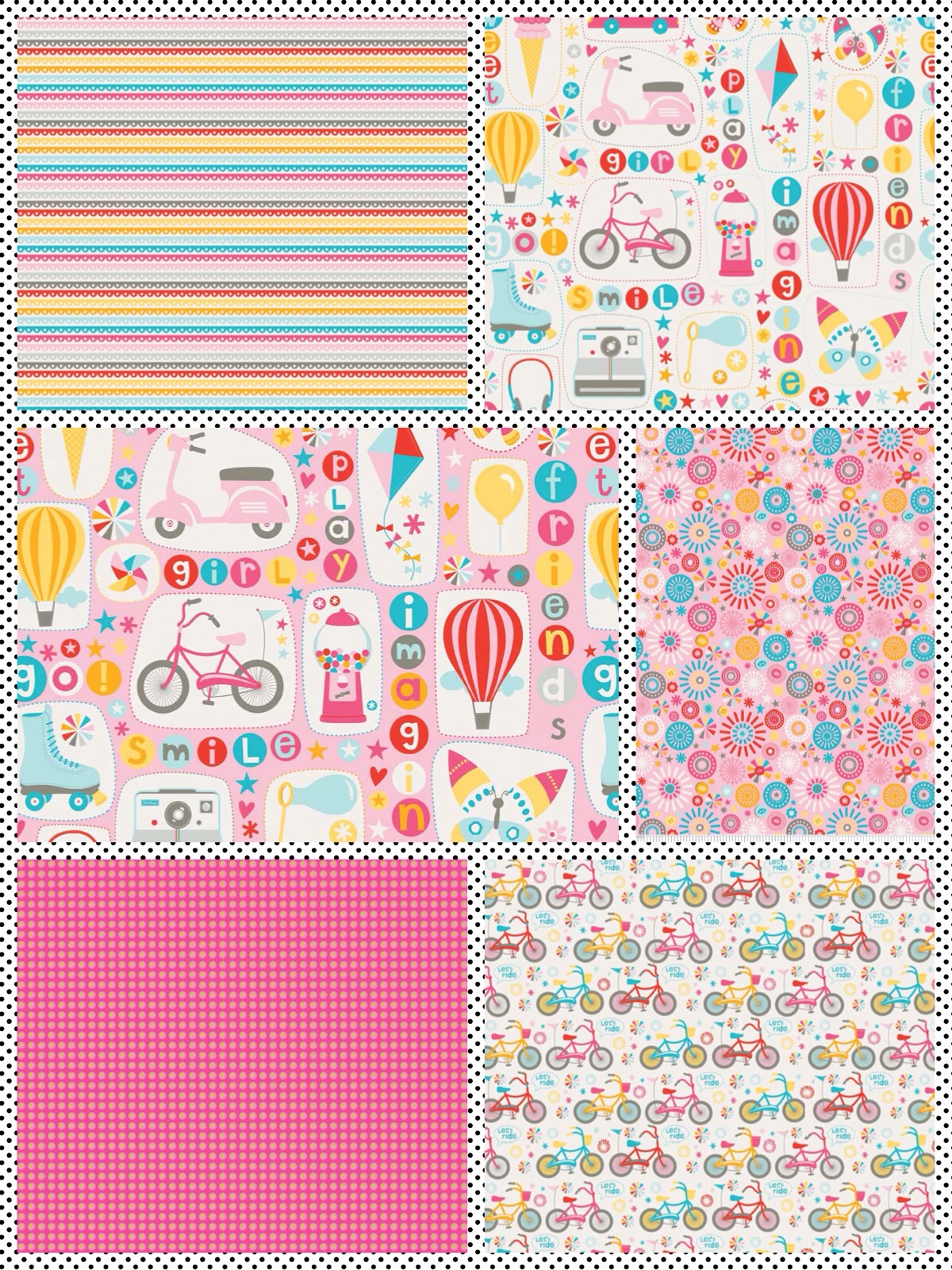 Shipping to us very soon is Girl Crazy from Riley Blake. Everything a girl loves, including skates, balloons, ice cream and of course, my favorite,..bikes!