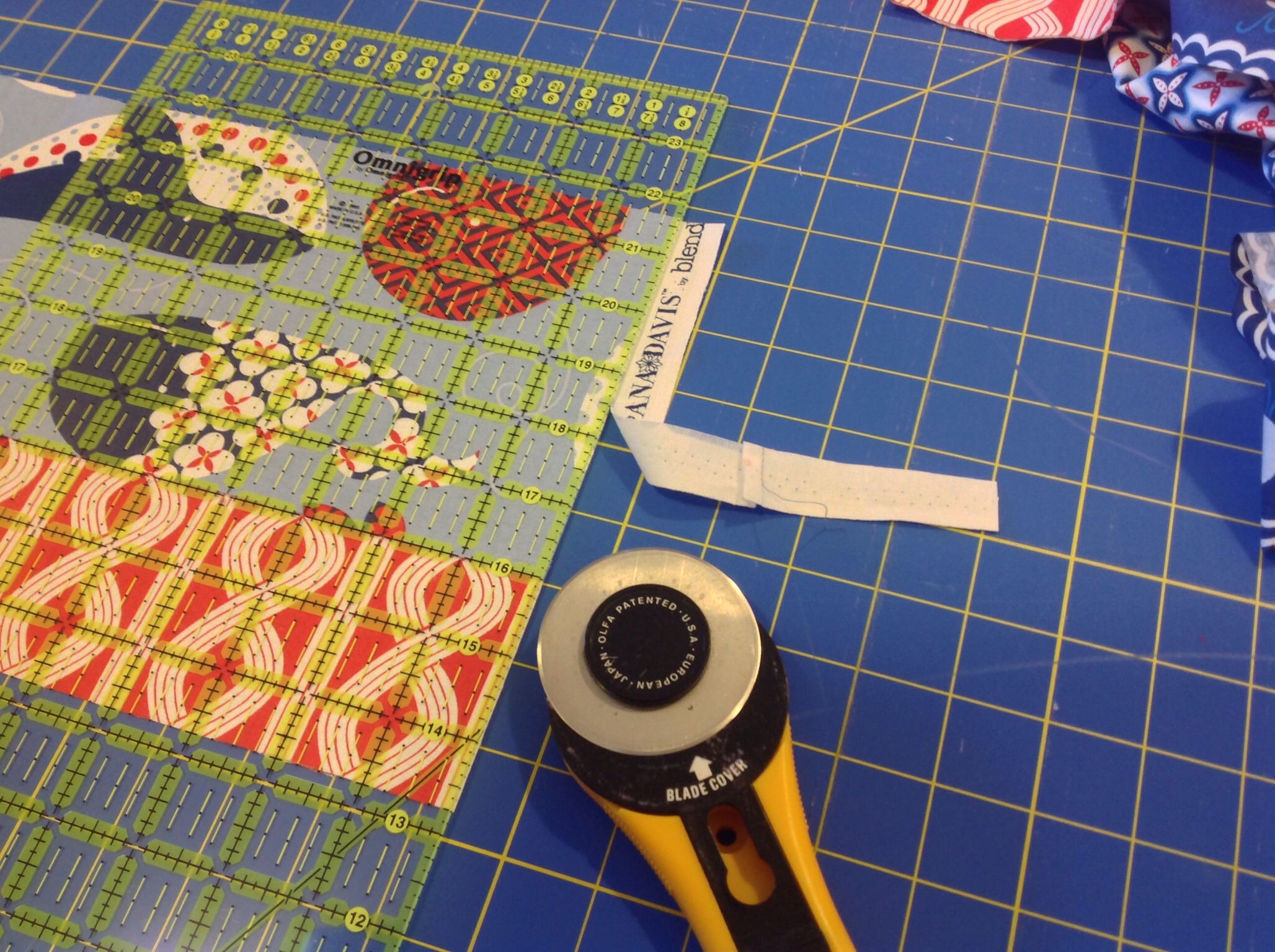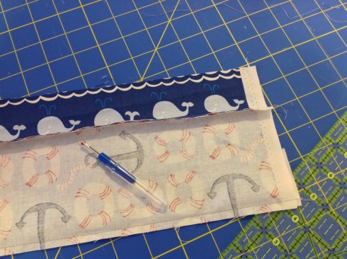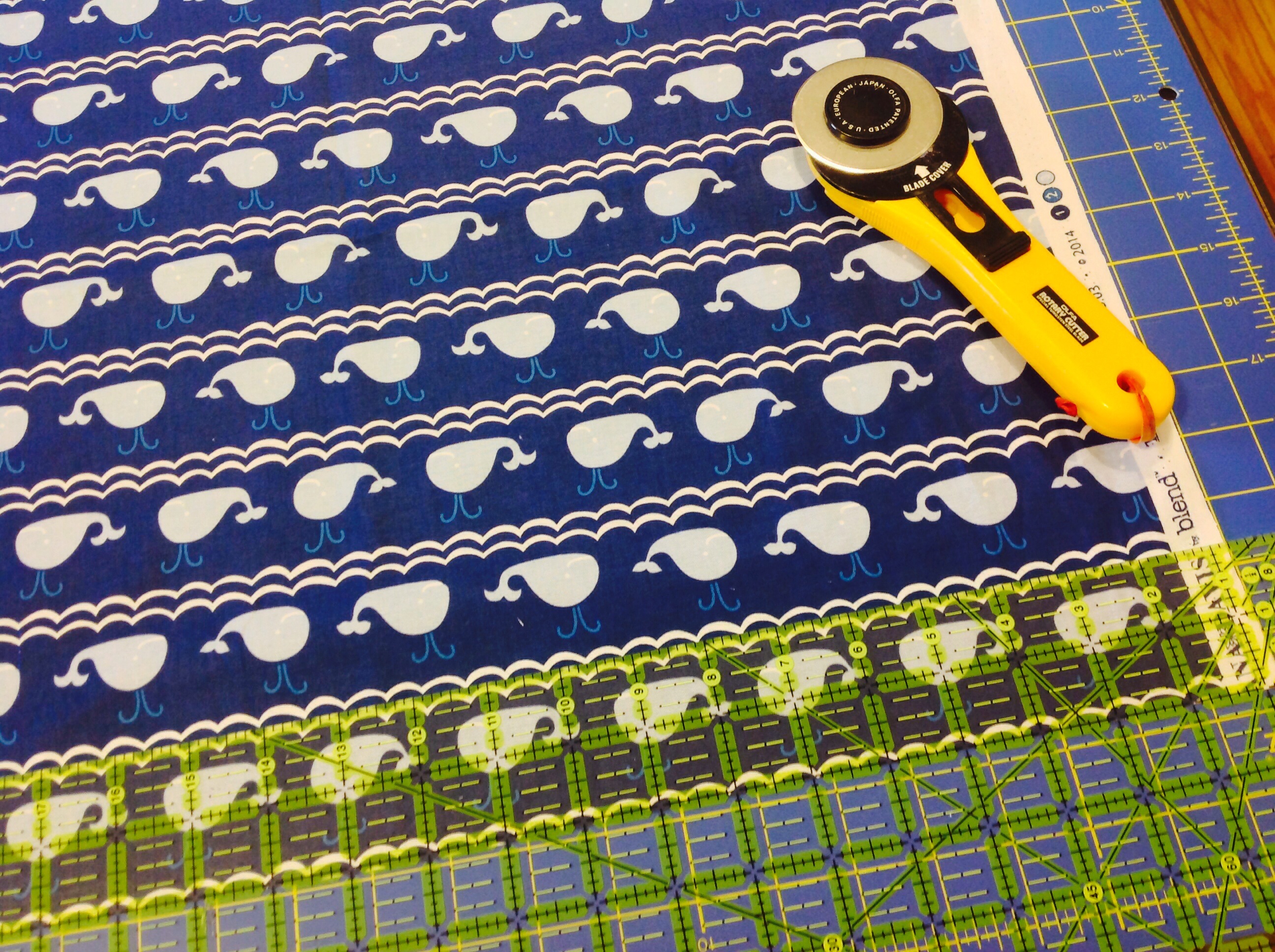I fussy cut the baby whales to make this quilt, but it wasn’t any trouble to do so since the fabric was printed really straight to begin with. Straighten the edge of your fabric so that the ‘white wave’ is on the cut. Line your ruler up for the 2 inches. The white wave that’s next in line should fall somewhere on that 2 inches. As you can see in the photo, my ruler lined up between the waves.