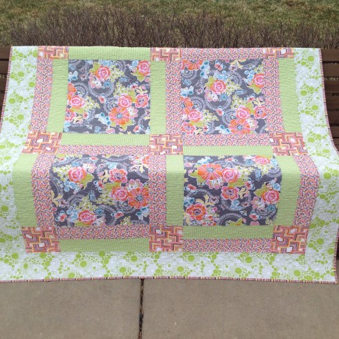 Welcome spring and summer in with a fresh new quilt! Brighten up your decor, add to a girls bedroom or take it on a picnic. We have designed a quilt kit with the new fabrics from designer – Josephine Kimberling for Blend Fabrics. The fabrics feature fun fruit, flower designs and modern geometric shapes.