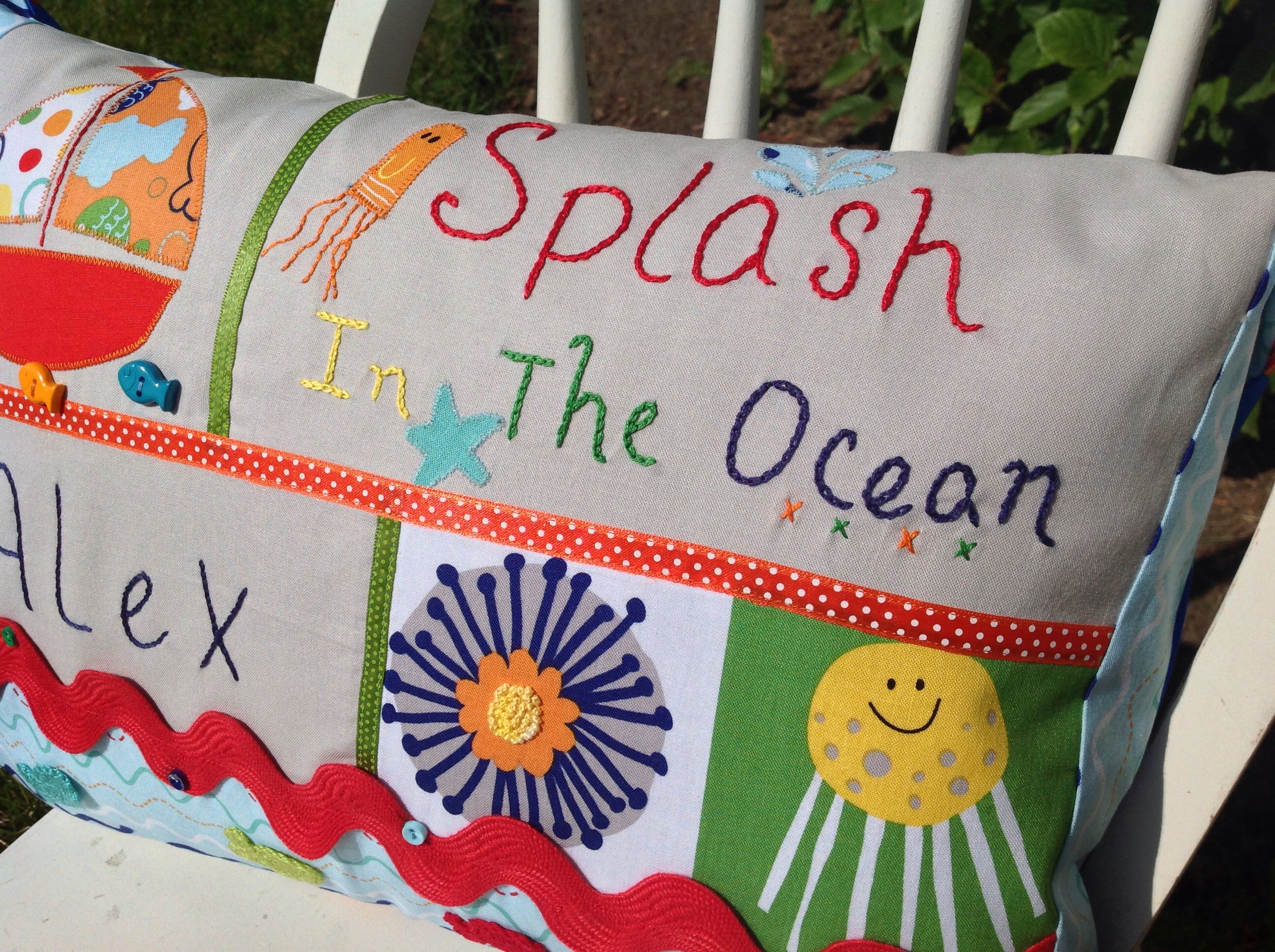I like projects that I can embellish and use different techniques like appliqué & embroidery. A chain stitch for the Splash really made the words ‘pop’ and adding the accent French knots to the anemone gave that some extra dimension too.