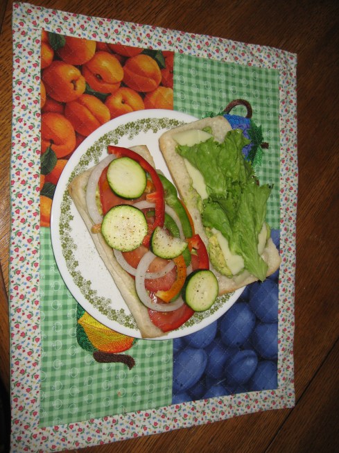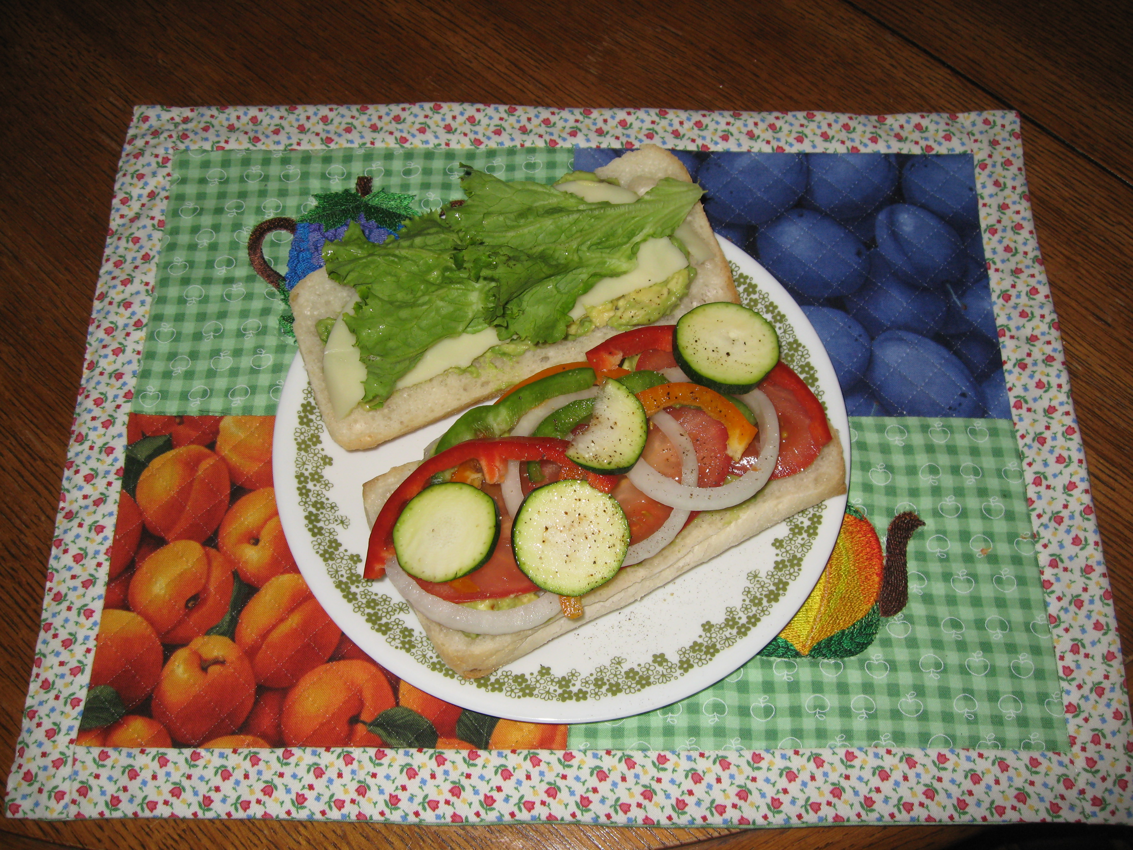 Veggie sandwich on sub rolls. If you can get the Gonnella, it’s the best bread for this. I used guacamole instead of mayo, cut fresh red & green peppers, zucchini, lettuce, Vidalia onion, provolone cheese, Roma tomatoes. This was super tasty on a hot day. The guac really made this one stand out.