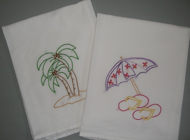 I continued with the summer theme by whipping up some summer tea towels. Umbrellas in the sand, flip flops and palm trees.