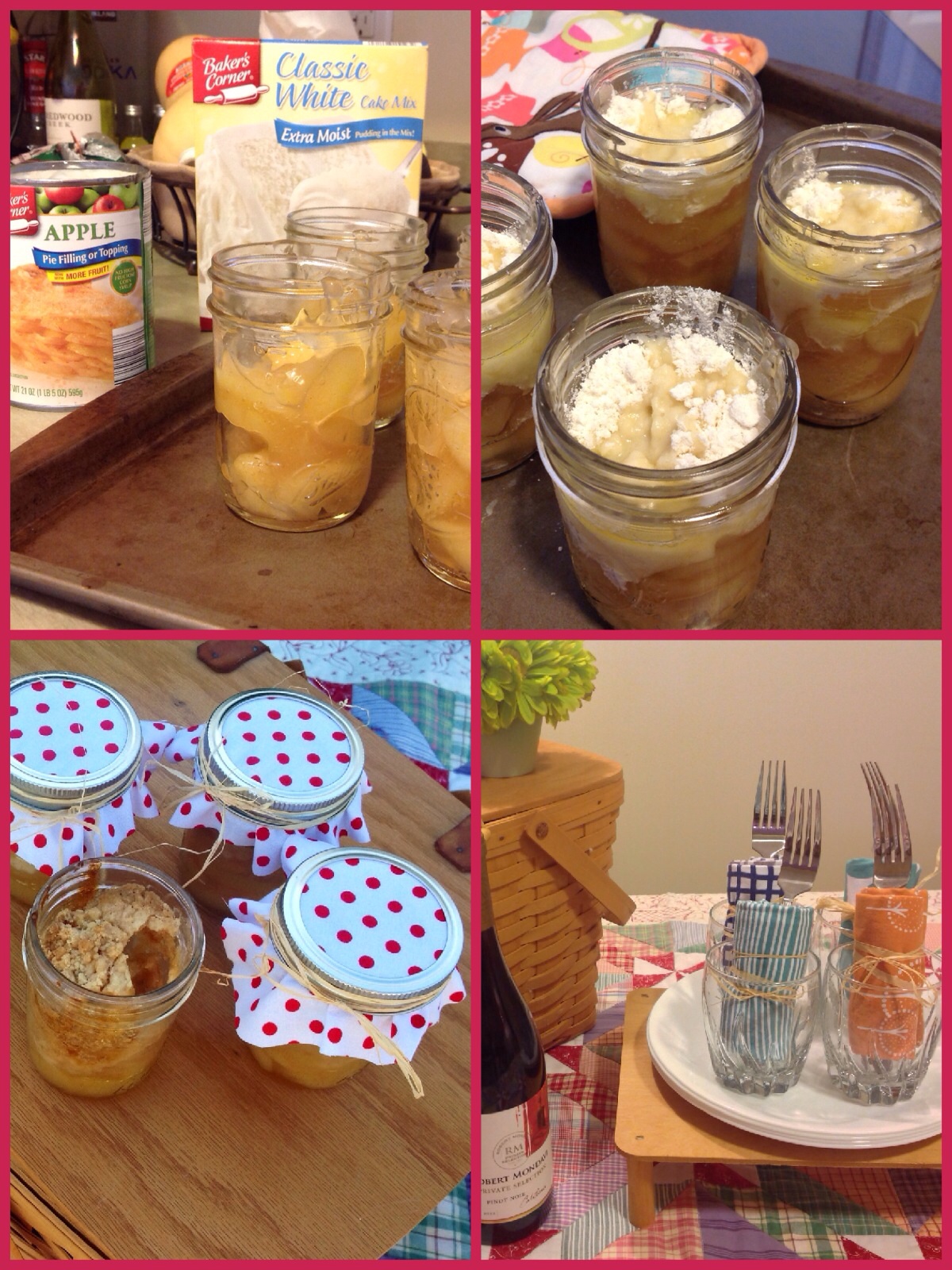 I made Dump Cake in mason jars. Three ingredients and jars and you’ve got yourself a perfect picnic dessert…White cake mix, pie filling, and melted butter. Fill the jars 3/4 full with filling, spoon dry cake mix on top, drizzle with melted butter and cook @350 till you have a bubbly, crispy goodness. Top the jars with cut fabric and tie with raffia for crafty effect.