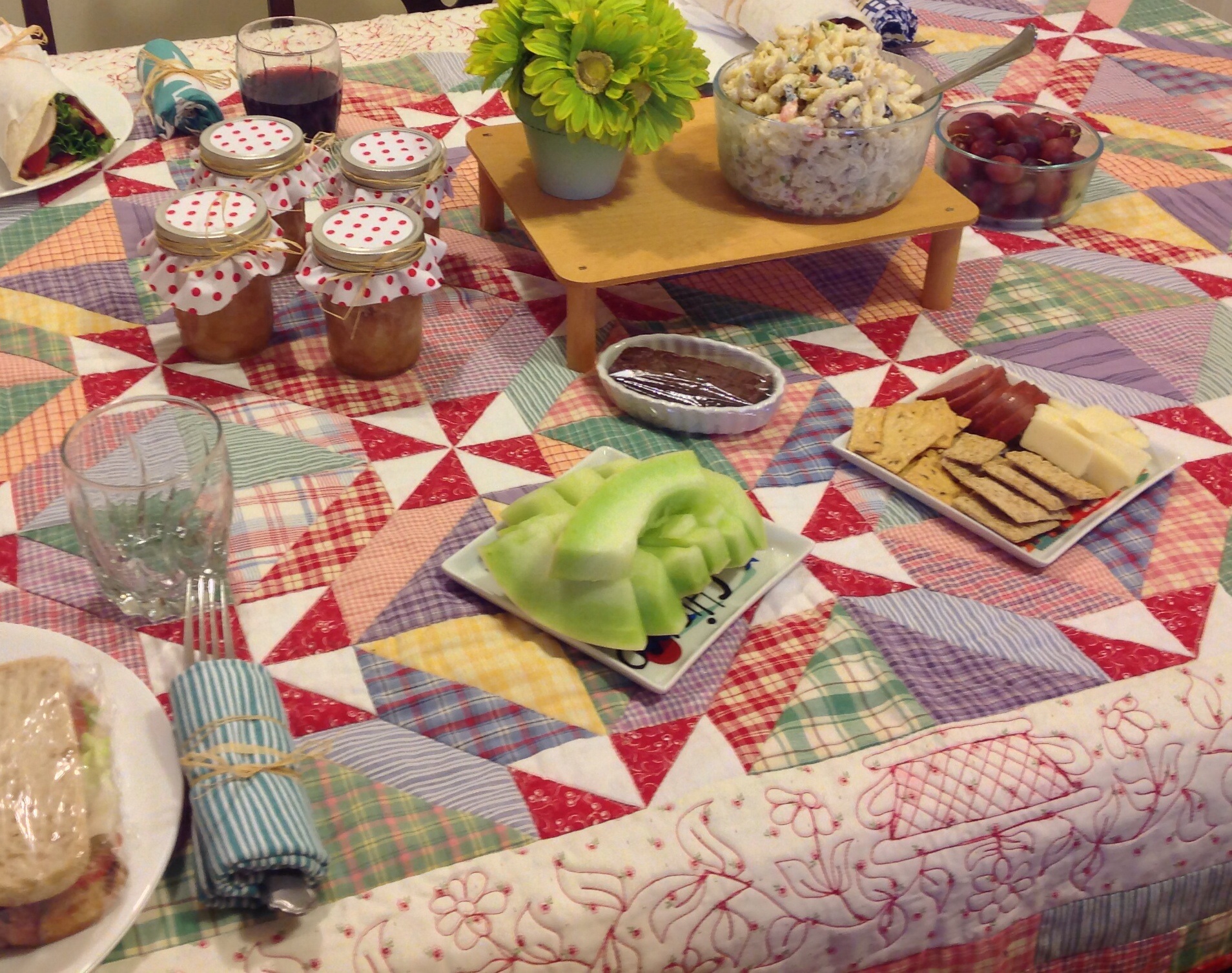 Don’t fret. Make do with what ya got! Throw the quilt on the “picnic” table and pretend we’re at our destination and have a great time with friends, laughing, eating and playing cards. We even saw the sunset during our stroll after dinner.