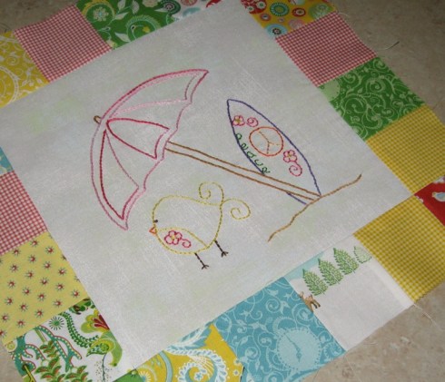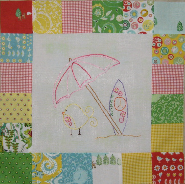While, I thought Little Miss Shabby’s June block was cute, I wanted to stick to a June theme. And what better thing to do in June than go to the beach. Birdie loves to surf and soak up the sun.