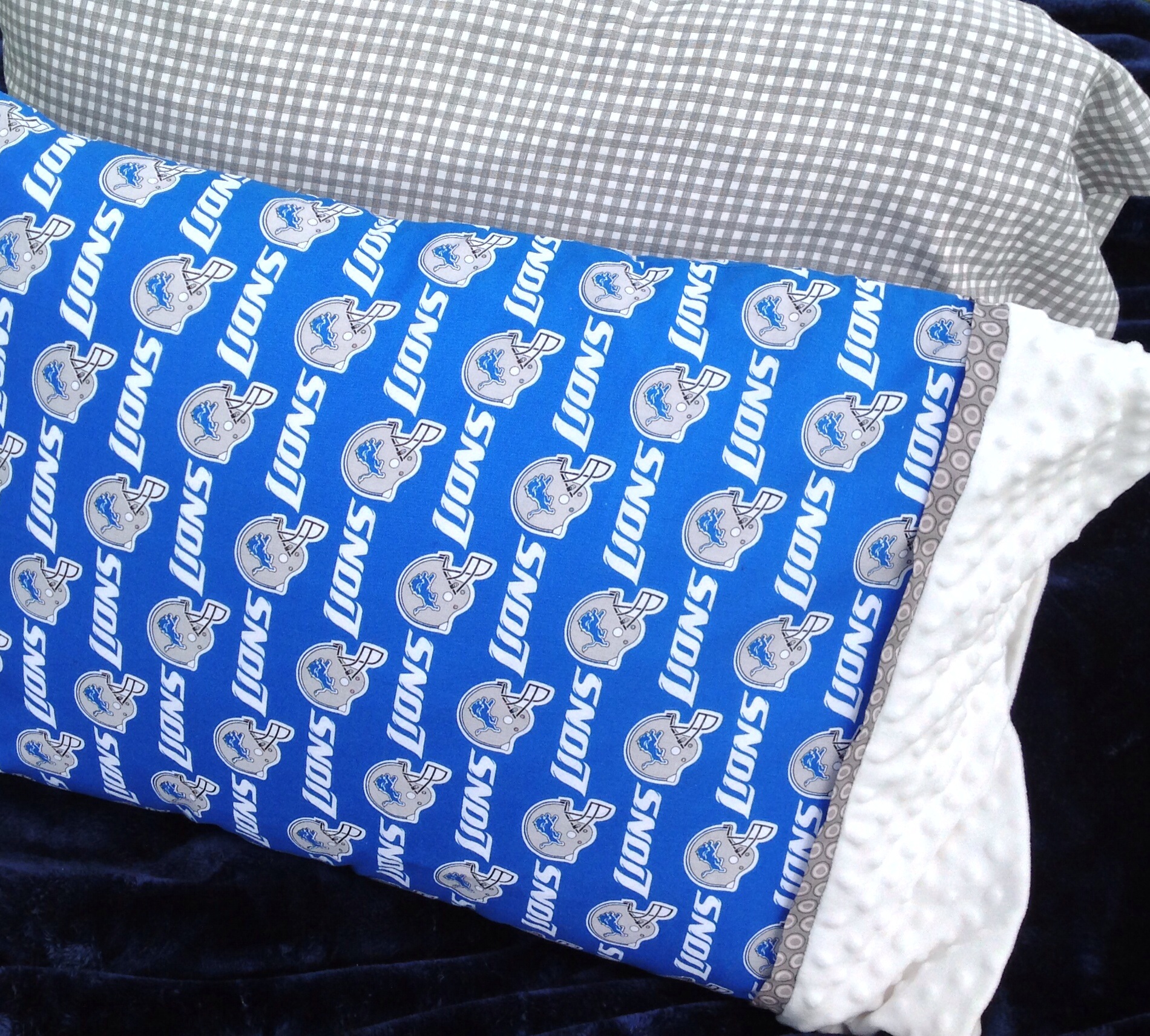 I made this pillowcase for a big Detroit Lions fan using this tutorial from Twiddle Tails. This fabric is a bit hard to find in Bears territory!