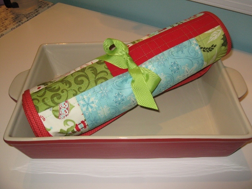 I rolled them up, tied them with a pretty ribbon and gave them away with a casserole dish.