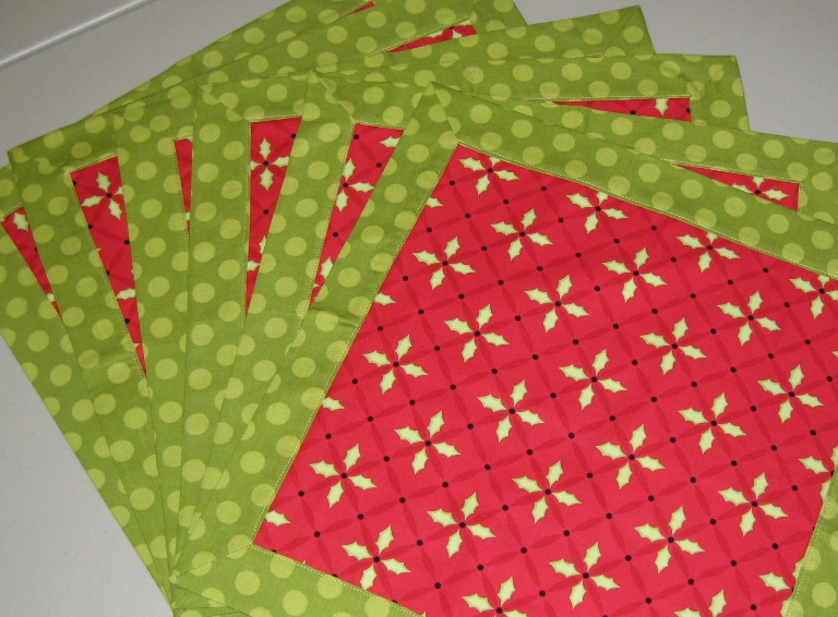 Here’s a set that my SewMod friend Andrea made up with some of the Bespoken fabrics. Check out her Funky Placemats Flickr page. She’s made several cool ones!