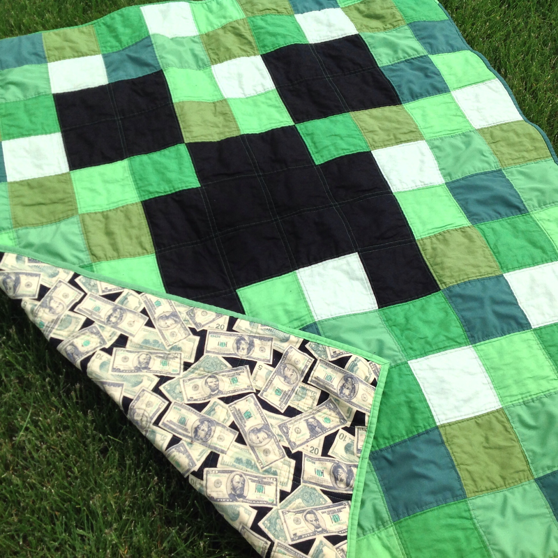 I used money fabric for the back. It has nothing to do with MineCraft but I knew the little guy would like it. And I was right because when his mom took it off his bed to wash it, she discovered he was hoarding actual money under it! …kids, right? :)
