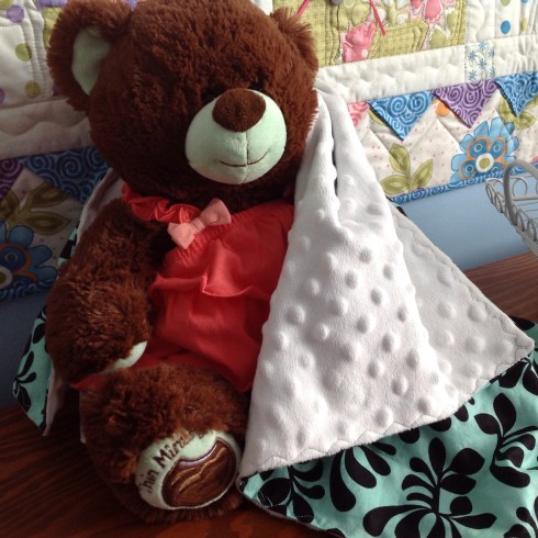 A Minky Blankie for a Build A Bear using our tutorial. Easy peasy! I had planned on making ‘Minty’s‘ clothes too, but happily found out that the newborn size at Target fits just right and at only about $8/outfit!