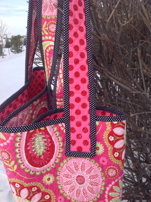 The quilted yard spent so much time tucked away, I didn’t have any more of the matching binding, but I do believe I’m glad! Because I’m totally in love with the black polka dot. It makes the bag fabric pop alive don’t ya think?!
