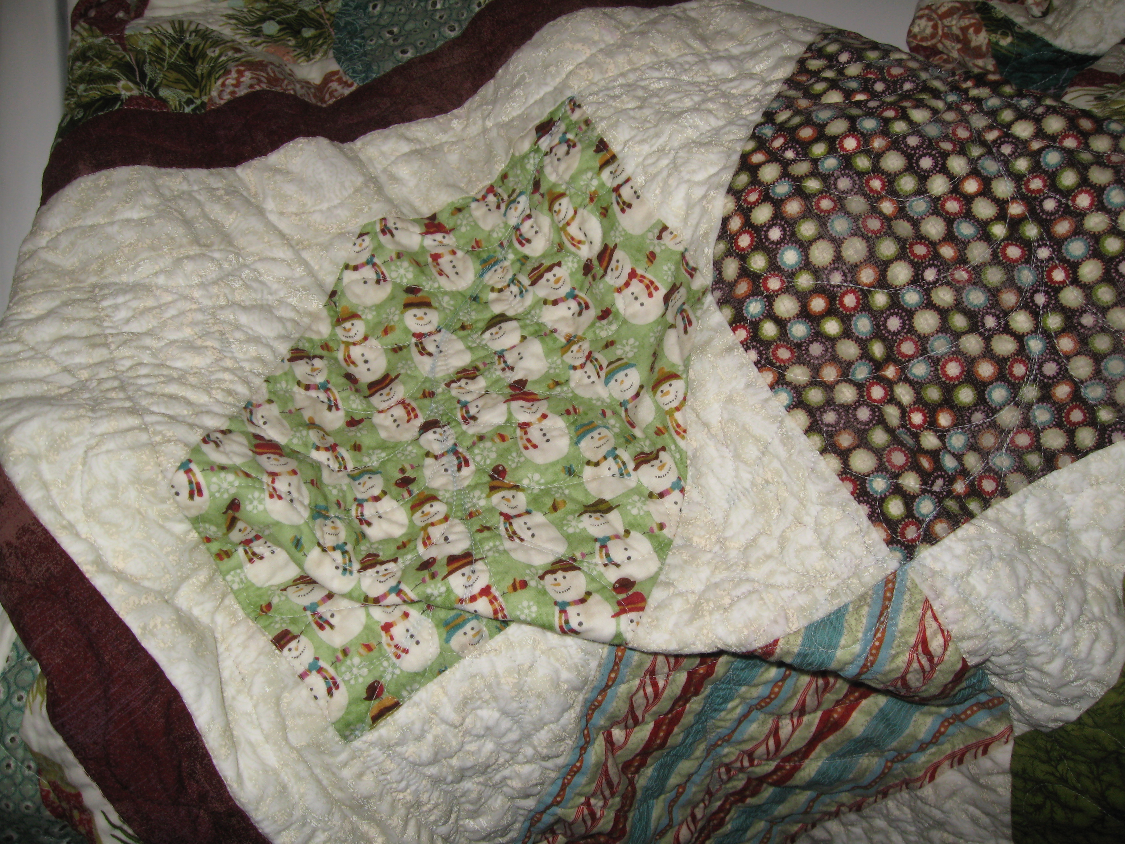 Just got it back from the quilter and she used a blue marking pen on it. Need I say more? I really hate those things. They are very unpredictable! For starters, I’m not the girl who washes a quilt when I get it done. I like crisp and fresh. So that’s a little disappointing, but what’s a bigger disappointment is that I’m going to end up trashing something I worked hard on, cost a lot of money, cause let’s face it people fabric is not cheap, and it’s from my favorite lines of all time…ugh. I’m sooo frustrated. These are the pics of the quilt after it’s been washed a zillion times using a zillion methods. You may need to enlarge them for the blue to show up.