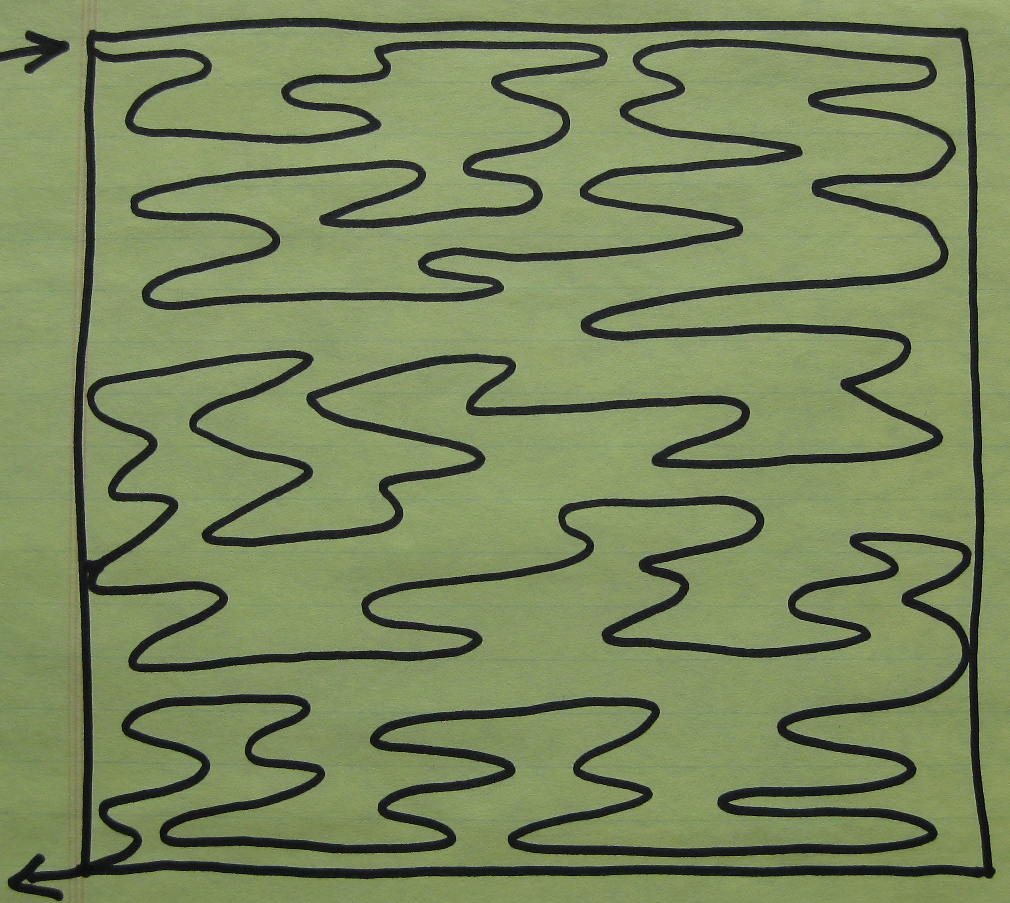 Square 2 – Start at any corner you are most comfortable I tend to work this pattern from top left to bottom right. Basically this is a swaying motion back and forth as you meander across the space. This pattern gives you the effect of a water if you follow my lines you will see how that works. I have used this design on a landscape panel with a pond -the water came alive. It can also be used in a sky to create a eerie stratus type cloud perfect in those Halloween panels!