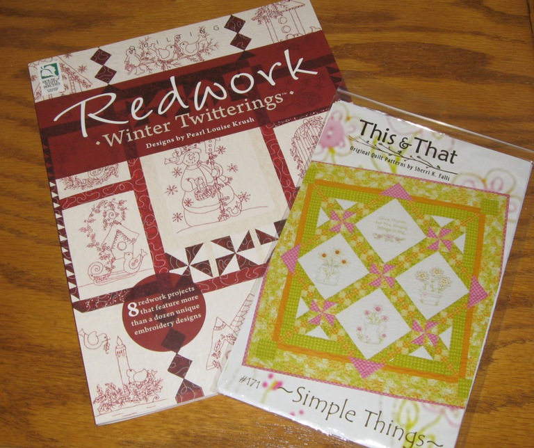 And last, here are my latest embroidery purchases from the quilt store. A quilt pattern from This and That Pattern Company called “simple Things” and a redwork called “Winter Twitterings” by Pearl Louise Krush.