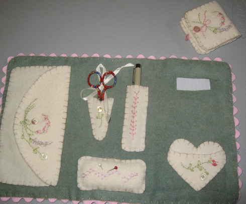 It’s pretty big. It measures 9″ x 15″ and holds everything you’d need for a trip, which is perfect for me! A place for scissors, a pen, needles. It has an envelope inside for a small notepad or your flosses. It even has a pincushion.