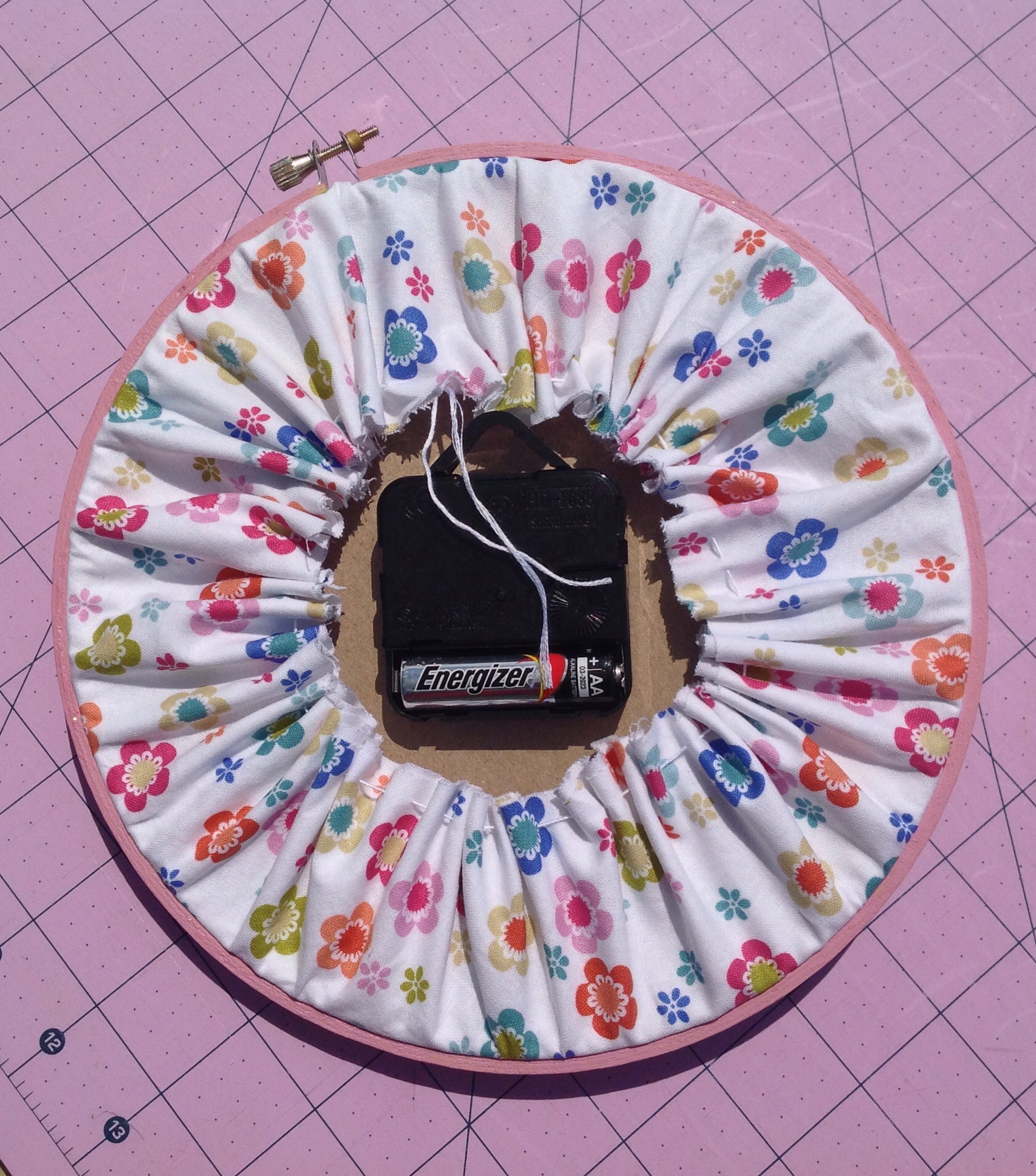 Using a piece of embroidery floss, create a gathering stitch in the fabrics. Pull and knot the thread in the back to make the edges ‘finished’. This will help the clock lie flat against the wall when hanging. At this point, most hoop art is then covered from behind for a nice finished look, but if we do that, we won’t be able to change out the clock battery now will we?