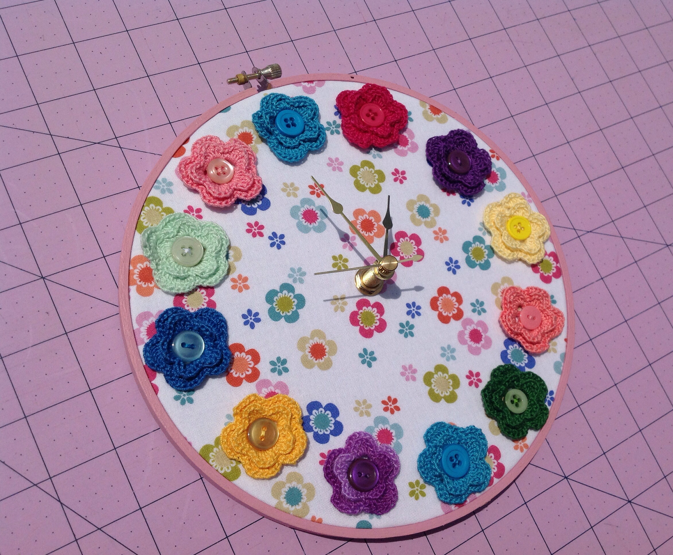 July 28, 2014 in Need2Create!, Tutorials | Tags: Button clock kit, Button clock tutorial, crochet flower embellishments, Crocheted flower clock, Flower clock, Handmade clock for a little girls room, hoop art, How to make a clock, Sewing room clock | by Lorrie | 2 comments