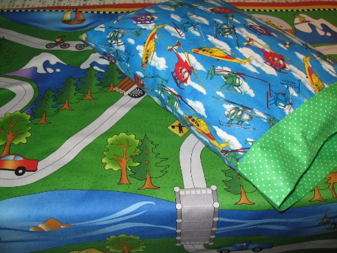 This was a travel pillow set with a play mat quilt panel with a road scene backed with flannel. A great idea to keep that little boy busy on the floor with all those Hot Wheels!