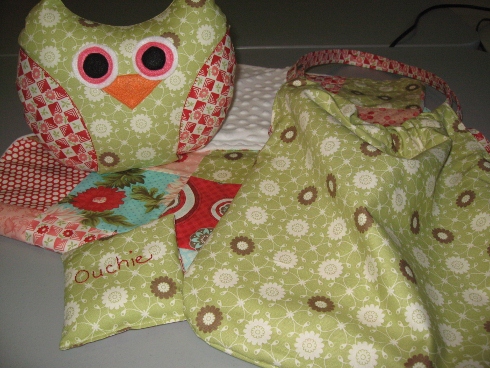 A baby set including an Owl, Minky Blankie, Ouchie Bag and a Bag for the new mommy to enjoy.