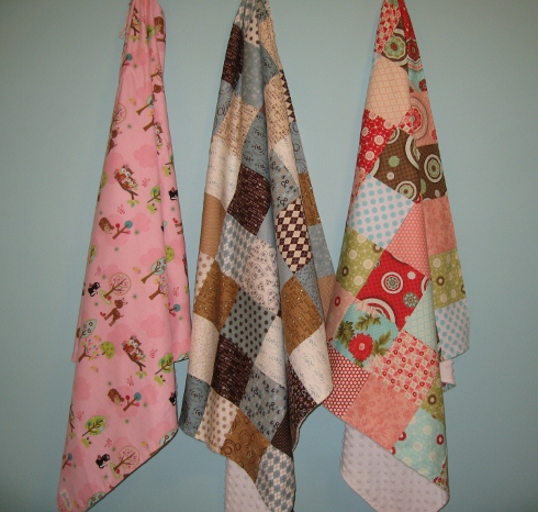 We’ve made 3 new blankies for the Etsy Shop using the pattern on our tutorials page. These make up in about a hour or two and I’m sure everyone out there has a charm pack that’s waiting patiently in your stash for it’s turn to be made into something! If not, or your running out of time, these are available in the shop starting today.
