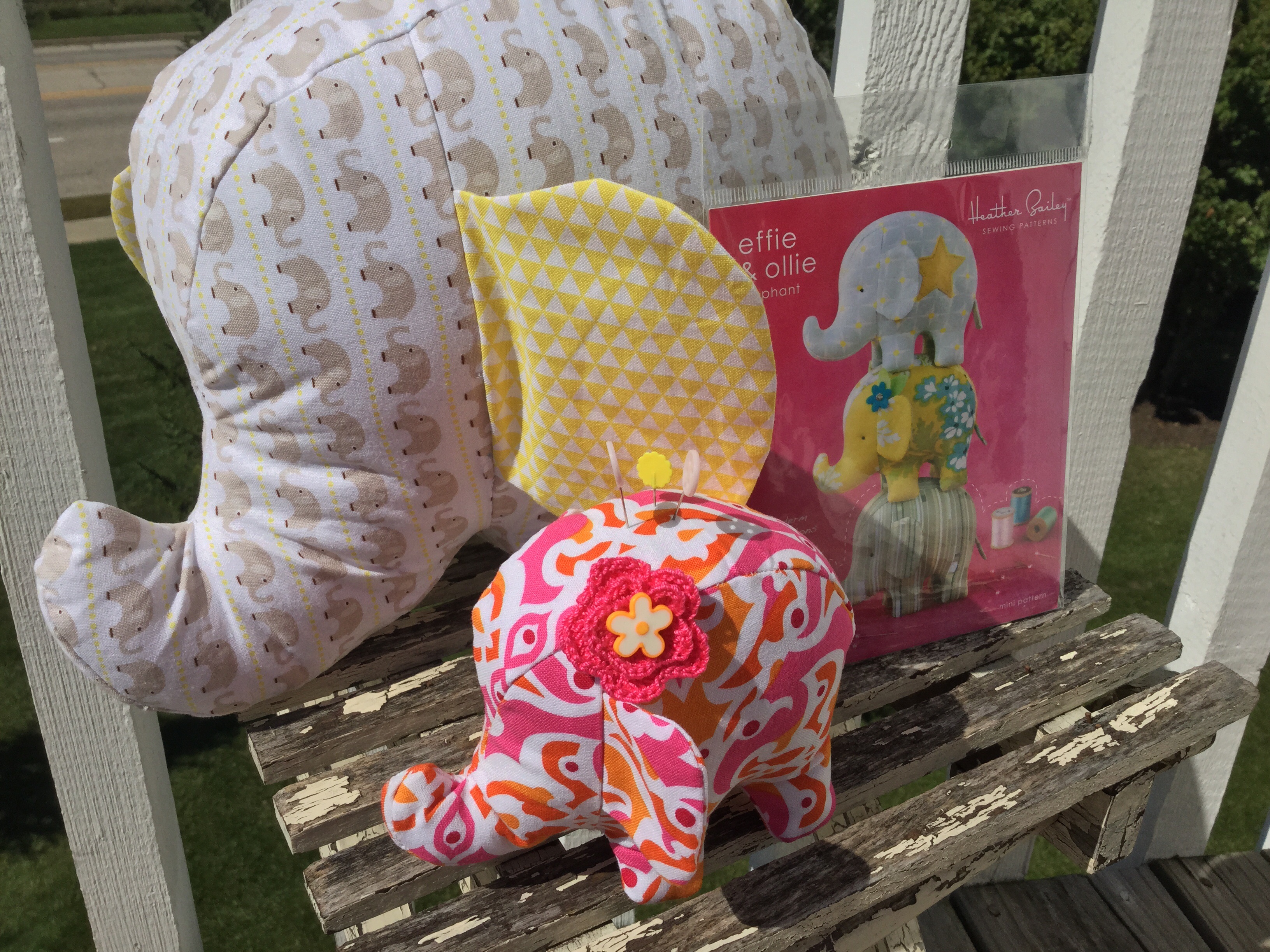 Effie The Elephant was a big hit. A cute little pincushion pattern by Heather Bailey. The pattern comes with the template for the small one but we thought it would be fun to enlarge it 175% and make a big softie for baby too!