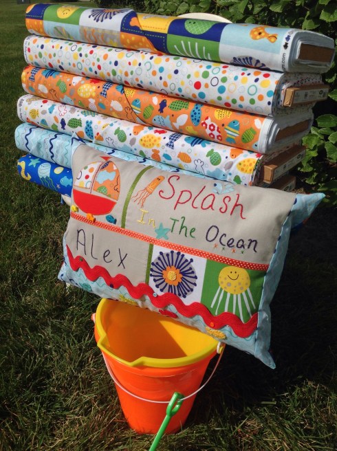 I couldn’t forget the back of the pillow. It deserves something just as special. I fussy cut the selvage since the fishes were representing the color codes. A simple zig zag to tack it down and now it’s done!