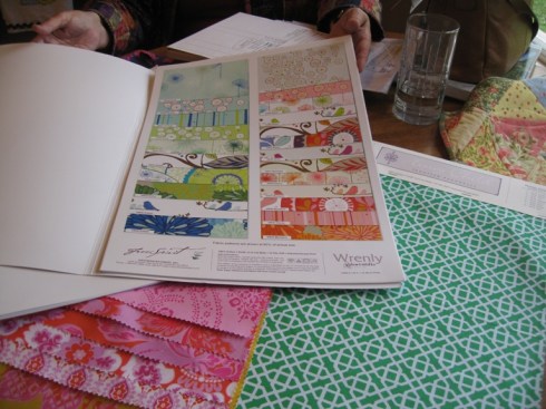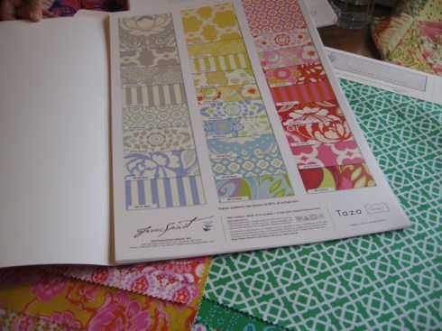The Rep from Westminster/Free Spirit was at the house yesterday. With the rep, you get to touch the fabric, see the samples. The computer just doesn’t do the actual colors justice.We did have to pick some of the newer releases from the printed swatches because they hadn’t made it to the states yet. Which is why it’s so important to be at market.They have all the fabric samples there.