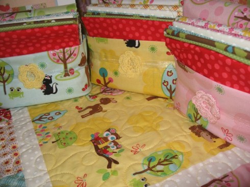 Lots of ideas for these cute flowers…hair clips and headbands for girls, scrapbooking, quilts. We even attached a tiny one to the cute appliqued owl for the Hootie & Friends quilt kit.