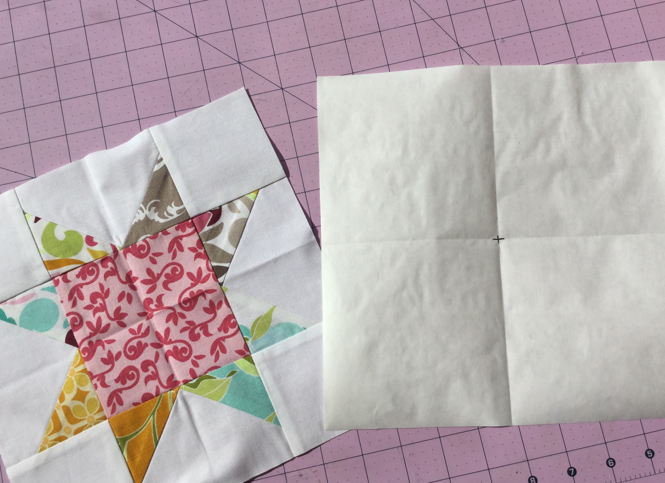 Place your freezer paper on top of the right side of the pieced block, shiny side down, lining up your ‘X’ in the center. Lightly press to keep it from shifting.